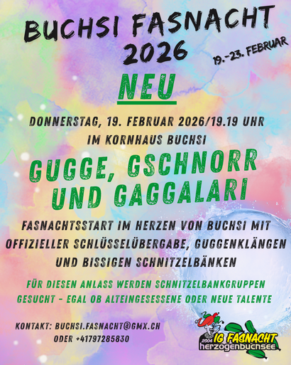 Wir freuen uns euch mitzuteilen, dass wir die Buchsi Fasnacht dieses Jahr bereits am Donnerstag mit Schnitzelbänken und Guggenklängen starten.